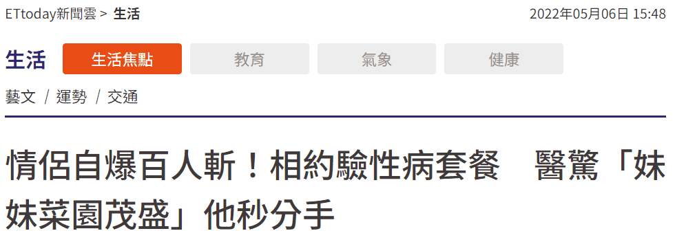 收治病例的泌尿科醫師蘇信豪表示,這對情侶年紀是20多歲,當天雙雙掛號進入診間,情侶開心地說,兩人是登山認識,知道彼此過去性經驗豐富,因為剛交往,也愛愛過幾次,想知道對方身體狀況,兩人討論好要做「性病套餐」。
