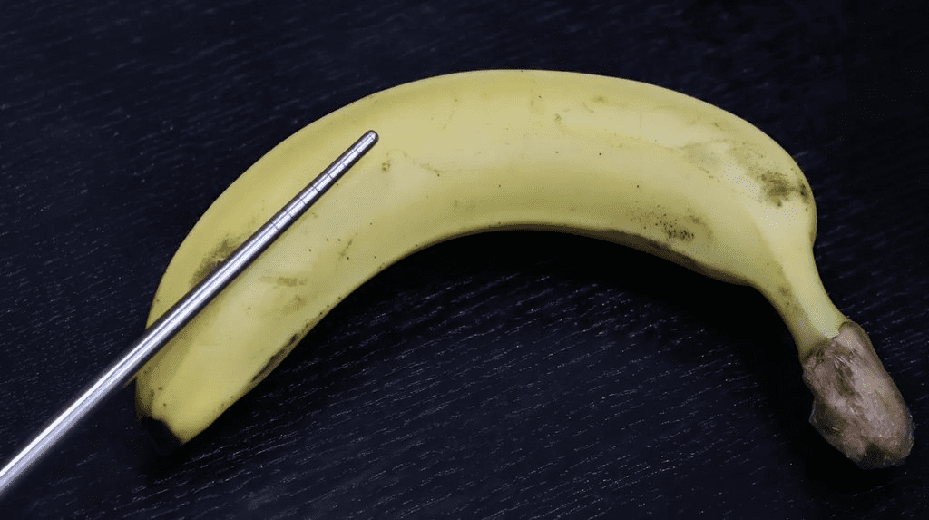 蘇信豪醫師以香蕉、筷子示意說明,塞異物進尿道,易在中段轉彎處刺傷尿道。讀者提供